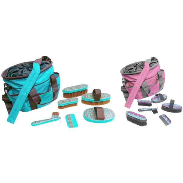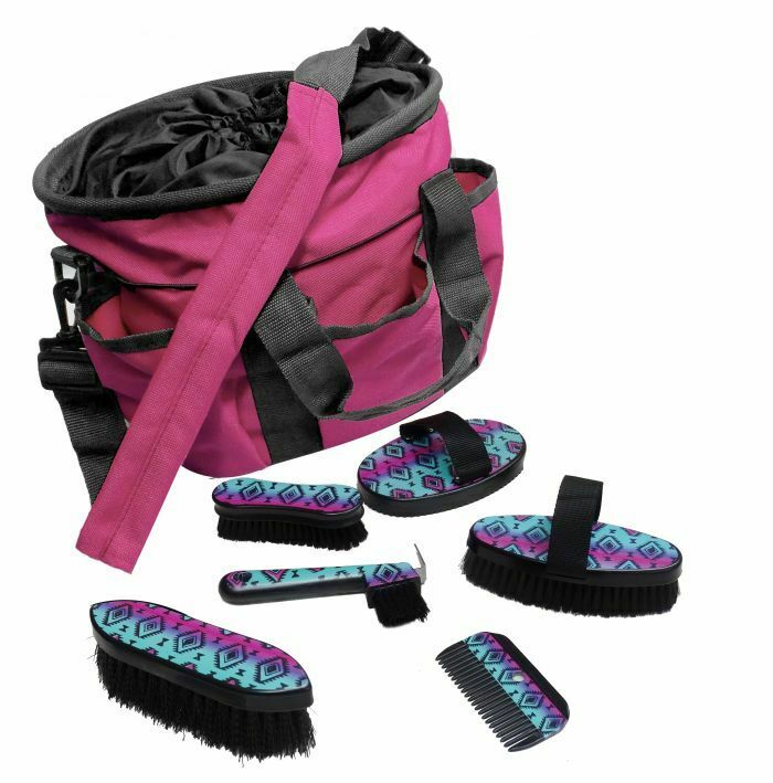 Showman 6 piece Navajo print grooming kit with nylon cordura carrying bag. Grooming kit comes with plastic curry comb, mane comb, hoof pick with brush, and 3 assorted styles of brushes. MPN 72BT001