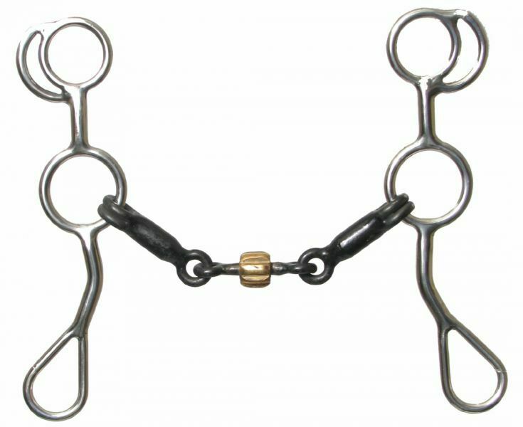 Showman Stainless steel training snaffle bit with 7 1/4″ cheeks.  Features a 5″ sweet iron 3 piece snaffle with a center dog bone and copper roller.  MPN 18176