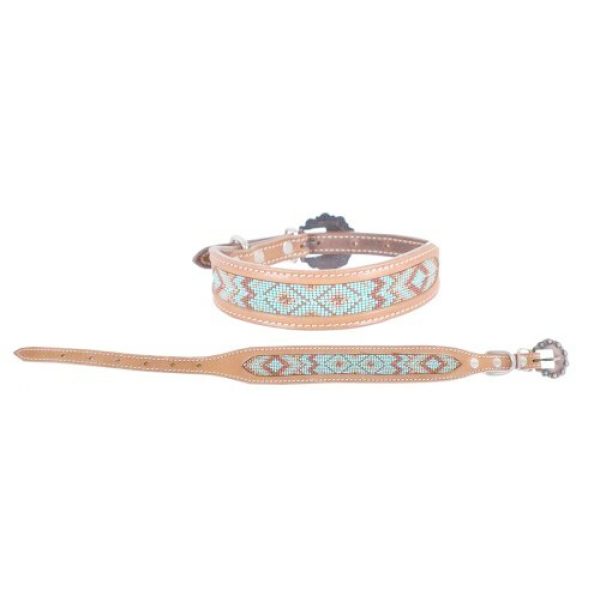 Showman Couture ™ Genuine leather dog collar with beaded inlay. This 1″ leather dog collar features a medium leather with teal, gold, and burgundy navajo beaded inlay design and copper hardware. MPN DC-27