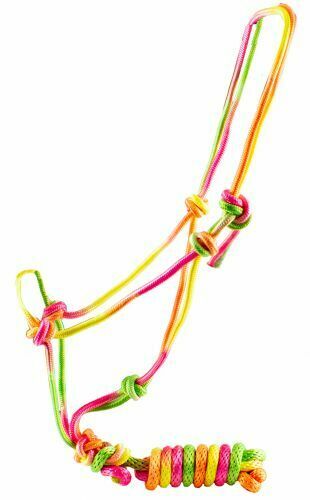 Rainbow colored knotted cowboy knot halter with matching lead. This cowboy knot halter comes complete with a 7′ matching lead. MPN 4343