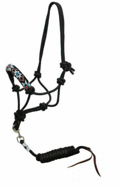 Showman Beaded nose cowboy knot rope halter with 7′ lead. This rope halter features a beaded cross design on noseband. Removable 7′ round braided lead with leather popper. MPN 16360