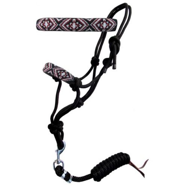 Showman ® Beaded nose cowboy knot rope halter with 7′ lead. This rope halter features a red, black, and white beaded cross design on noseband. Removable 7′ round braided lead with leather popper.