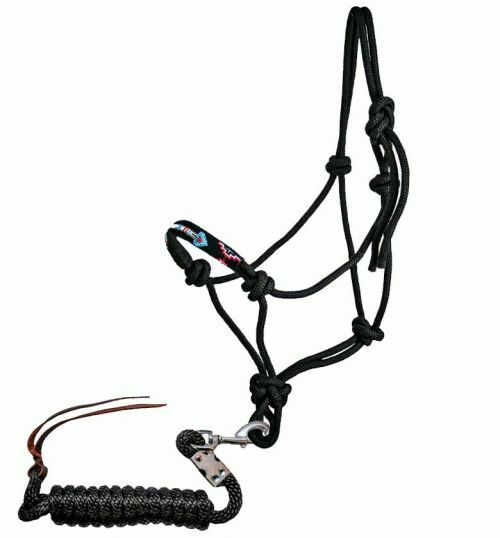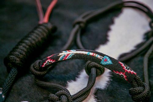 Showman Beaded arrow black rope halter with lead rope. Halter features turqoise, red, and gold beads.  MPN 16366  Also have available matching Bronc Halter MPN 16443, Wither Strap MPN 19466, Bridle/Reins/Breast Collar/Wither Strap MPN 13850, Headstall MPN 74062 & Saddle Bag MPN 176779