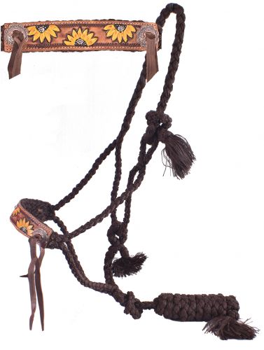 Showman® Woven brown nylon mule tape halter with hand painted sunflower noseband. This mule tape style halter features woven nylon with a removable 8′ lead. Features a wide leather noseband with hand painted sunflower noseband and two copper conchos, tassel end at the tie point and tassels on the removable lead. Halter is lightweight and excellent for ground work or any other in-hand training.
