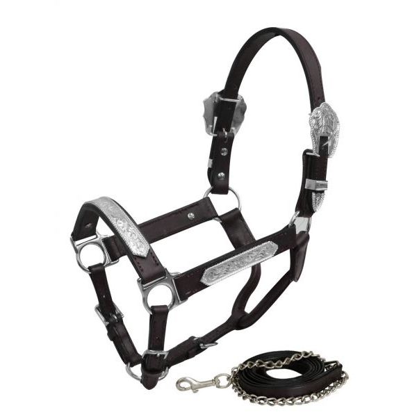 Showman ® Yearling Size double stitched leather show halter with engraved silver plates. Halter features double buckles on crown and three way adjustable nose and throat latch. Comes with 3/4″ x 6′ leather lead with stud chain. Made by Showman ® products.