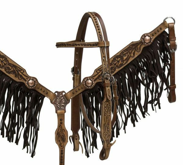 Showman double stitched leather headstall and breast collar set with black suede fringe and floral tooling. This headstall features medium leather with floral tooling and accented with antique copper buckles and conchos. Browband headstall comes with 5/8″ x 7′ leather split reins. MPN 6015