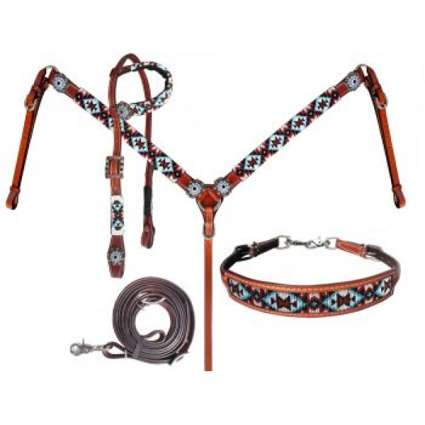 Showman ® Beaded Southwest Design 4 Piece Set. This set features medium leather with a with a Southwest beaded overlay with brown, turquoise, and white beads. Set is accented with silver conchos with turquoise beads turquoise beaded buckles. Set comes with single ear headstall, breastcollar, wither strap, and contest reins.