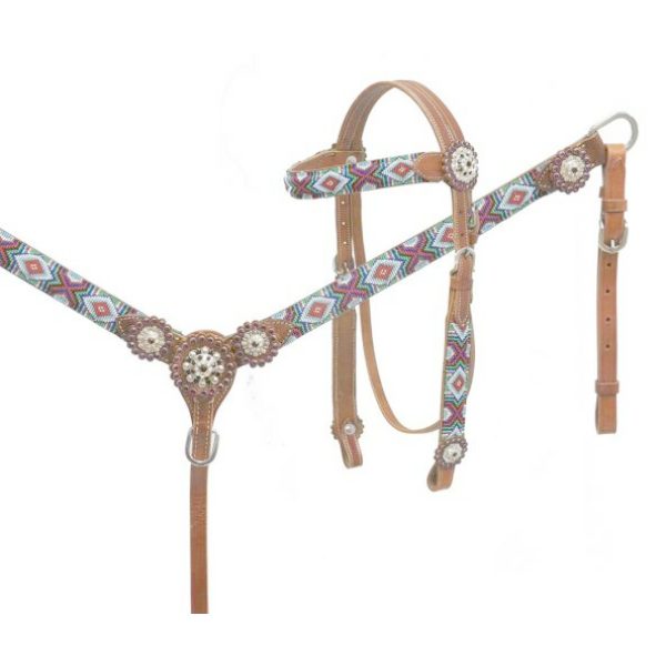 Showman Beaded headstall and breast collar set. This set features medium leather with a multicolor bright beaded overlay and is accented with rhinestone conchos. Headstall comes with 5/8″ x 7′ leather split reins. MPN 7015