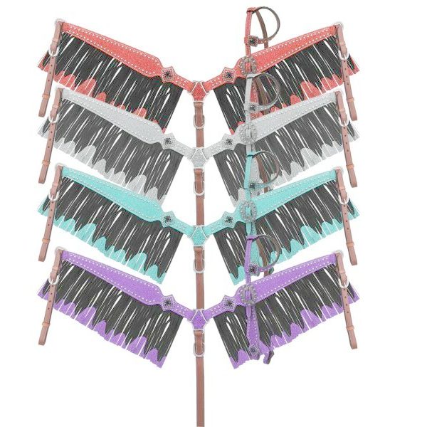 Showman Glitter overlay single ear leather headstall and breast collar set with crystal rhinestone studded hardware and glitter fringe. This set features medium leather with a glitter overlay accented with silver studs. Breast collar features black suede leather fringe with a glitter pattern on bottom. Headstall comes with 5/8″ x 7ft leather split reins. MPN 13856 Also have available matching Rope Halter MPN 16455, Curb Strap MPN 176454, MPN Spur Straps 176458, Contest Reins MPN 19423, Youth Spur Straps MPN 30860, Tie Down MPN 161141, Bit Guards MPN 176453, Tie Down Keeper MPN 176460, Pony Wither Strap MPN 176511, Horse Size Wither Strap MPN 19411, Breast Collar MPN 13887