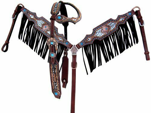 Showman Alligator print one ear headstall and breast collar set. This set features medium leather with silver aligator print and turquoise buckstitch. Engraved copper conchos are accented with turquoise stones. Large copper vintage style buckles and hardware are accented with turquoise stones. Breast collar features black suede leather fringe. Headstall comes with 5/8″ x 7ft leather split reins. MPN 13819