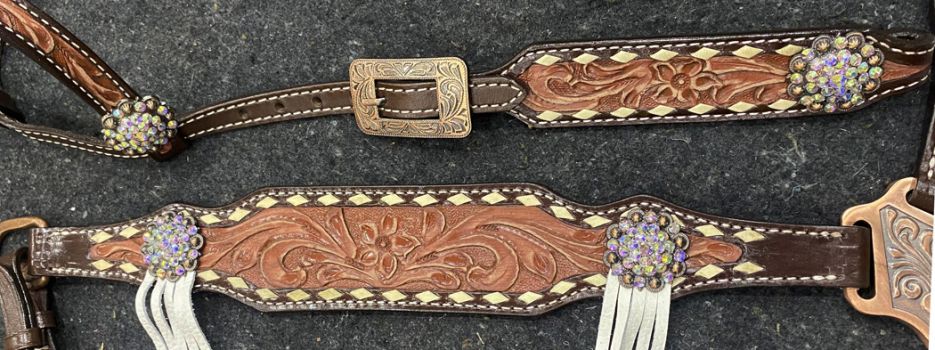 Showman ® Two-Tone Tooled Single Ear Headstall and Breast Collar Set with rawhide lacing and fringe accents. This set features a dark colored leather with medium oil tooling, features silver bling conchos and light suede fringe accent. Set includes one ear headstall, breast collar, and competition reins.