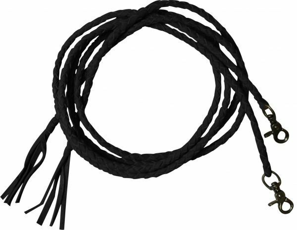 Leather 6 1/2 ft long braided western split reins with scissor snap ends make it easy to attach to bit. 6 1/2 ft long from scissor snap to end of tassel. Approx 1/2″ diameter. Has matching leather slider that holds reins together. MPN 5825