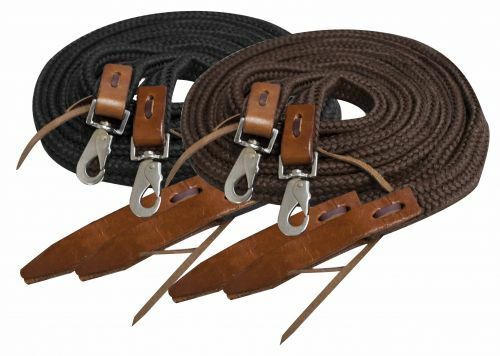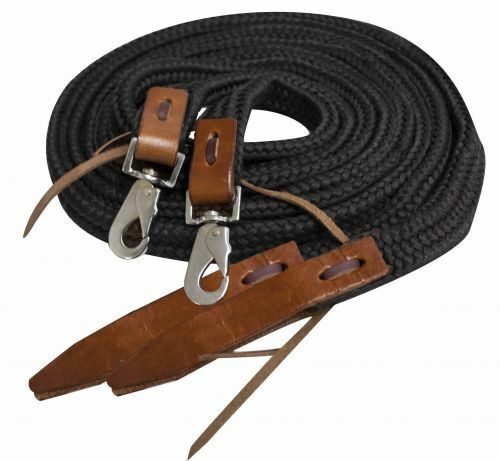 Showman 8ft flat braided nylon reins with leather popper ends and scissor snaps. MPN 19056