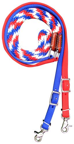 Showman ® Premium braided Red, White, and Blue nylon contest reins. 3/4″ x 96″ flat nylon contest rein with red, white, and blue round braided center and scissor snap ends. MPN 19584