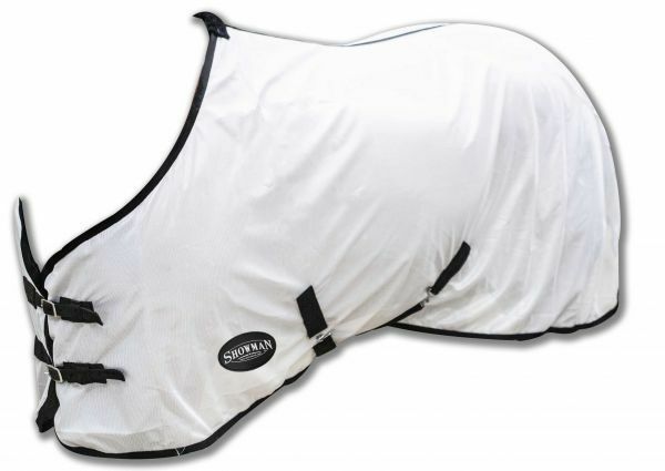 Showman Light weight fly sheet. Light weight fly sheet constructed of durable mesh with nylon trim and soft fleece wither protection. Open front design with two adjustable nickel plated buckles, adjustable T- hook surcingle belly straps, adjustable rear leg straps and tail guard. MPN 75211