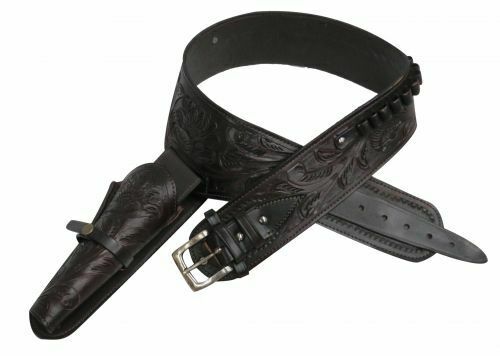 Showman 38/357 Caliber Dark oil tooled leather Western gun holster and belt. Equipped with leather tie strings to hold gun close to your thigh and reduce unwanted movement. Great for riding or conceal and carry. For proper fit, choose 2 sizes above pant size (pant size 38″ = belt size 40″). Belt has slots to hold rounds of ammo (changes with belt size). MPN 176056
