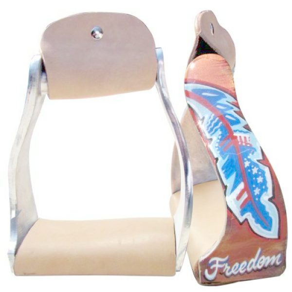 Showman Lightweight twisted angled aluminum stirrups with “Freedom” feather design. Bottom of stirrups are wrapped in light leather. These stirrups take the pain out of breaking in fenders. Neck is twisted to allow your feet to stay straight against the horse with out pressure on your ankle. MPN 176553 Also have matching Wither Strap MPN 176057, Bronc Halter MPN 16183 and Saddle Pad MPN 23032