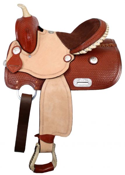 13″ Double T youth saddle with 3/4″ half breed suede leather seat. Saddle features basketweave tooling on pommel, skirts and cantle. Saddle has inskirt rigging and a rawhide silver laced cantle. Roughout fenders and jockeys. MPN 957013