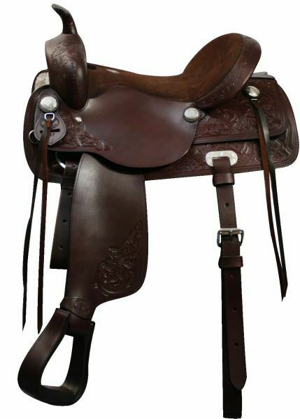 Double T Saddlery Pleasure Style Saddle 16″, 17″ seat . This saddle features smooth leather pommel, cantle, fenders and jockeys accented with floral tooling. Fully tooled skirts. Saddle is accented with engraved silver and leather strings. Saddle has engraved silver accents and conchos. Saddle comes equipped with back cinch. MPN 127