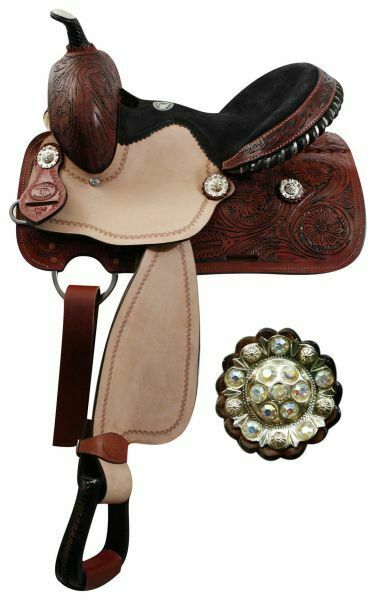 Double T Saddlery 13″ Youth barrel saddle with fully tooled pommel, skirts and cantle. Saddle features crystal rhinestone conchos, roughout fenders and jockies, rawhide braided horn, and a black suede seat with a black rawhide cantle with silver inlay. Saddle features inskirt rigging and close contact skirts. Comes with a leather latigo tie strap and off billet. MPN 119313