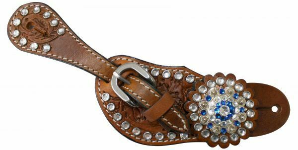 Showman Youth crystal rhinestone spur straps. These spur straps feature medium tooled leather accented with crystal rhinestones and colored crystal rhinestone rosette concho. Pre-punched adjustment 7.5″ to 8″. MPN 7159X